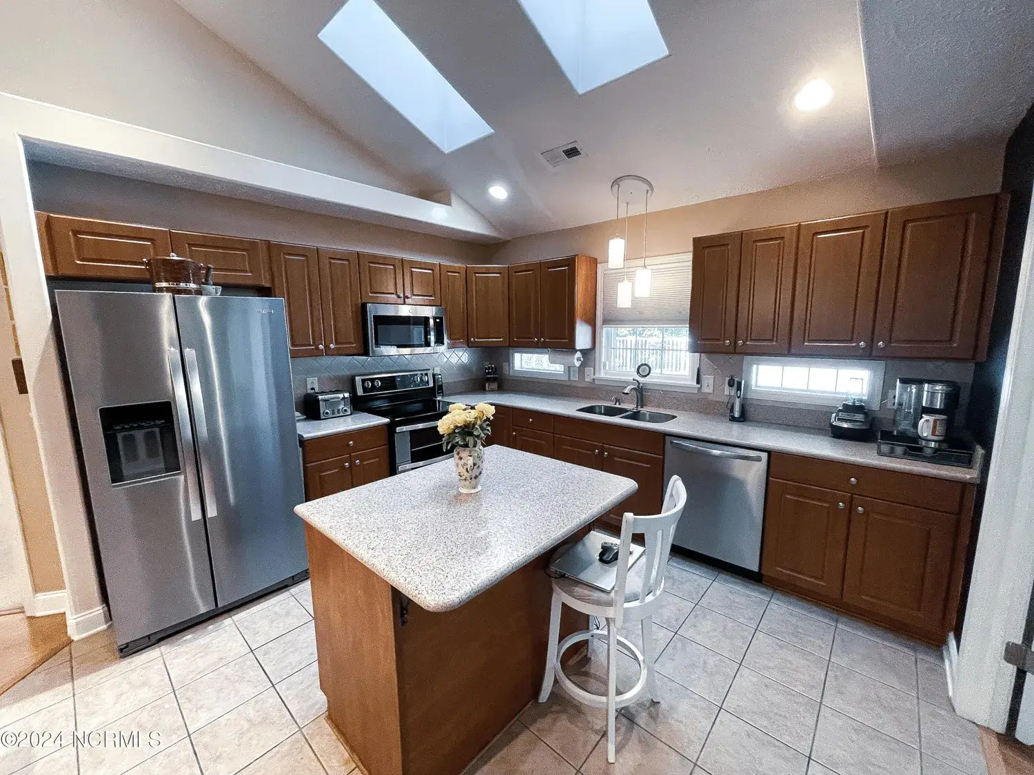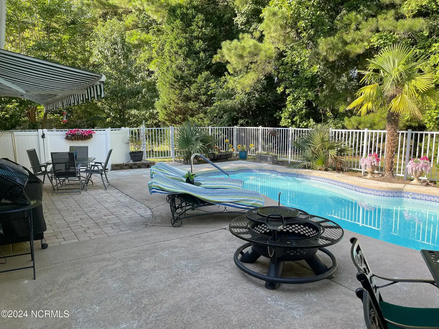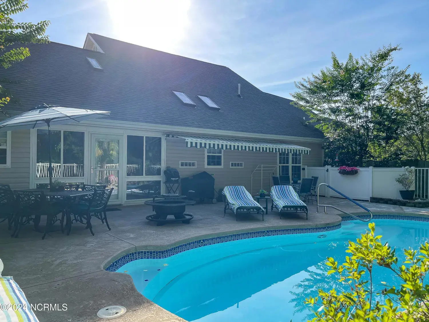 The well maintained in ground pool is fenced in and boasts wooded seclusion with no neighbors in the back! Main level includes the large primary suite which features a tiled walk in shower, as well as a front guest room and full bath. The third bedroom suite is privately tucked upstairs with a full bath. The kitchen has stainless steel appliances, solid acrylic countertops and beautiful backsplash. The sunroom features french doors and entry to the large laundry room. 2 car garage with storage. The roof is around 1 years old and the HVACS roughly 3 years old! LAWN CARE IS COVERED BY HOA! Down town New Bern can be reached in roughly 8 minutes and James City amenities in just 5. The closest Cherry Point gate can be reached in just under 15 minutes, and Morehead and Atlantic Beach in 45-50! PROPERTY LINES ARE DEPICTED IN PHOTOS 37-39